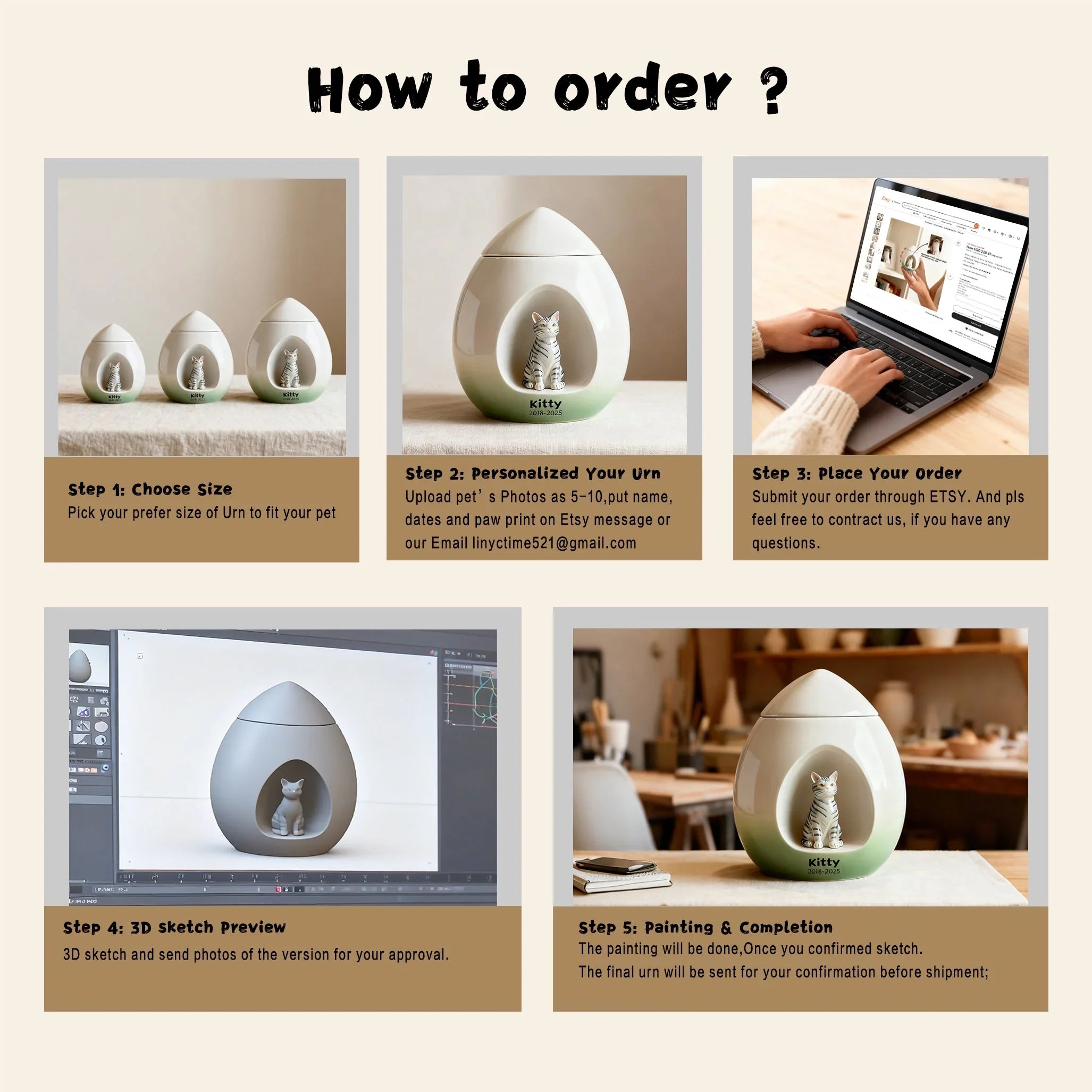 Every pet memorial is 100% handmade. This urn isn’t just a container—it’s a unique tribute crafted for your beloved pet. We handcraft each piece and recreate their likeness from your photo, adding their name and your personal message, so every detail truly captures their spirit.